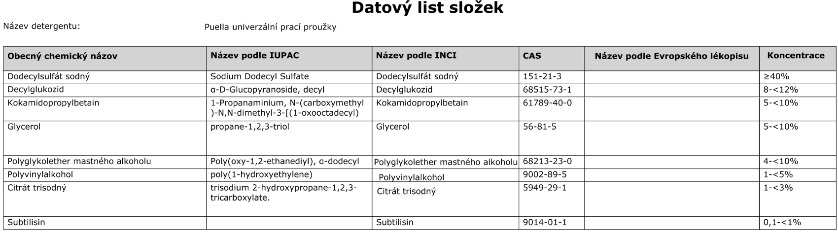 Puella univerzální papírky na praní – vysoce koncentrovaný prací prostředek vhodný pro všechny typy prádla s účinnými enzymy pro maximální čistící efekt. Varování! Tento produkt může způsobit vážné podráždění očí. PŘI ZASAŽENÍ OČÍ: několik minut je vyplachujte vodou. Vyjměte kontaktní čočky, jsou-li nasazeny, pokračujte ve vyplachování a vyhledejte lékařskou pomoc. Škodlivé při požití. Může způsobit podráždění pokožky a může vyvolat alergickou kožní reakci.PŘI STYKU S KŮŽÍ: Omyjte velkým množstvím vody a mýdla. Obsahuje: ≥30% aniontové povrchově aktivní látky, 5 <15 % neiontové povrchově aktivní látky, <5% enzymy.