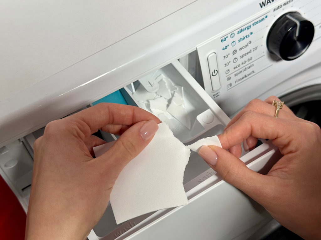 · Pokud zvolíte program předpírky, jednoduše natrhejte proužky na menší kousky, aby se vešly do přihrádky na prací prostředek v pračce (obrázek 1).