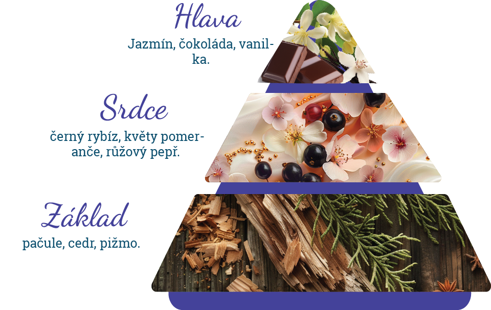 Vůně, která podtrhuje originalitu a smyslnost každé ženy, vás vítá sladkou harmonií jasmínu, čokolády a jemné vanilky. Zahalí vás do závoje neodolatelné tajemnosti, přičemž každá kapka podtrhne vaši jedinečnost. V srdci vůně se rozvíjí kontrastní a podmanivá kombinace – šťavnatý černý rybíz se mísí s jemnými tóny květů pomeranče a pikantním dotekem růžového pepře, které dodává vůni jiskru a hloubku.